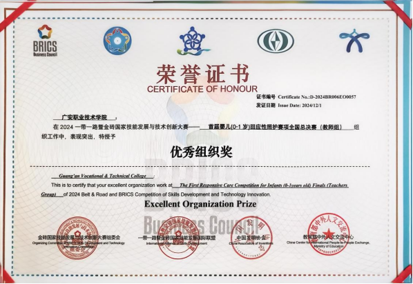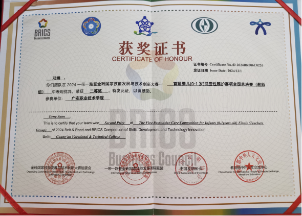 11月28日-12月1日,2024一带一路暨金砖国家技能发展与技术创新大赛——全国首届婴儿(0-1岁)回应性照护赛项(全国总决赛)在内蒙古自治区兴安盟市举行,永利yl23411集团教师邓娟喜获教师组二等奖。