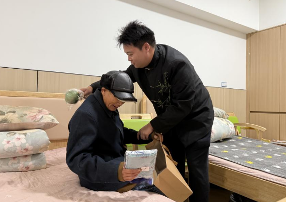 演出结束后,员工们主动走进老人寝室,开展暖心交流与慰问。他们耐心倾听老人的故事,悉心询问身体与生活状况,协助整理物品、打扫卫生,并送上精心准备的艾草锤、毛巾等慰问礼品。一句句真诚的问候、一次次温暖的握手,让整个康养中心洋溢着浓浓的温情与暖意。